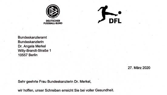 Am Anfang für die Wiederaufnahme der Bundesliga stand ein Schreiben der Deutschen Fußball-Liga DFL und des Deutschen Fußball-Bundes DFB an Bundeskanzlerin Merkel (Ende März 2020).